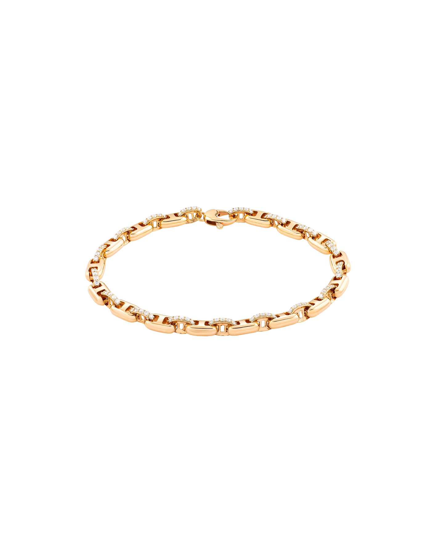 Pulsera de eslabones en oro rosa de 18 quilates, engastada con 0.80 ct de diamantes corte brillante que aportan un destello sutil y sofisticado. Su diseño versátil combina elegancia y modernidad, ideal para llevar sola o acompañada de otras piezas.