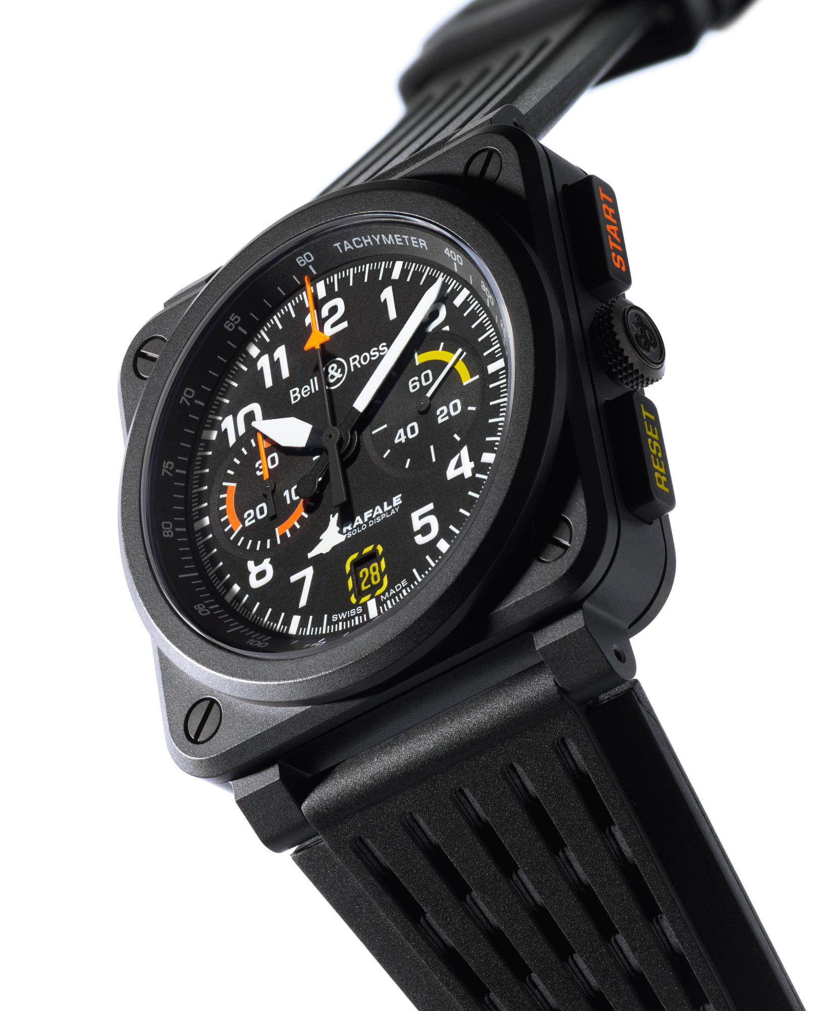 El emblema simboliza la unión de Bell & Ross con este espectáculo que busca presumir a uno de los aviones más avanzados de su generación, el Dassault Rafale. El BR-03 Chrono Rafale Solo Display, diseñado para los pilotos del Rafale, limitado a 500 ejemplares.