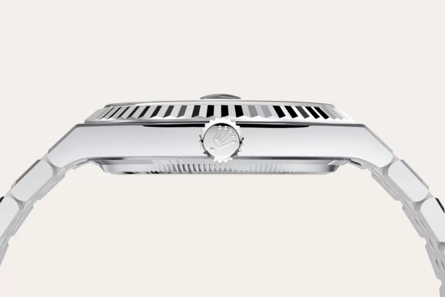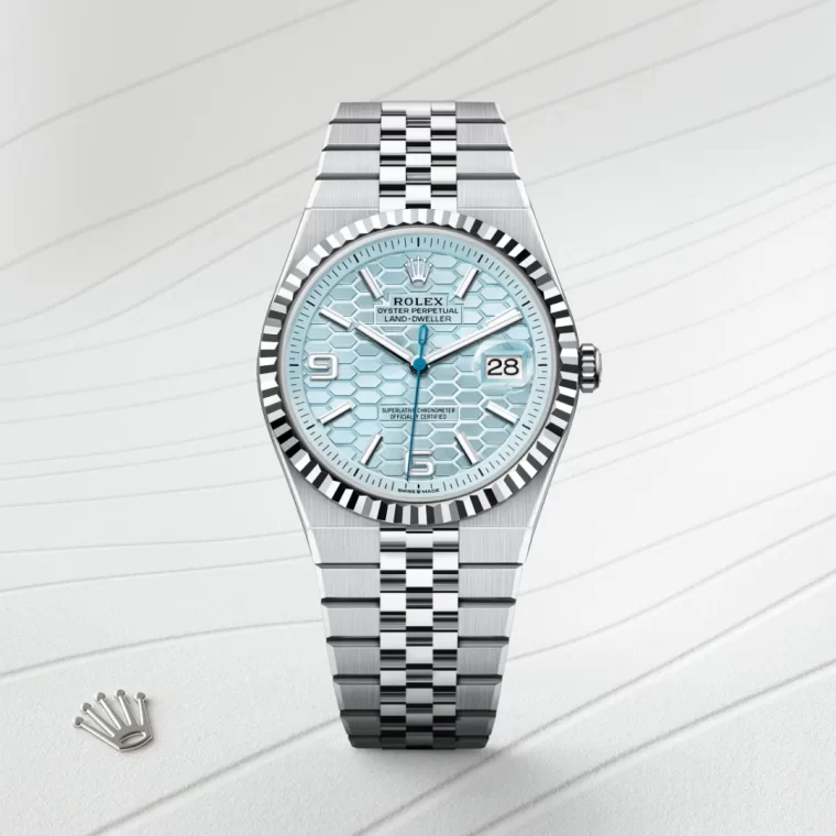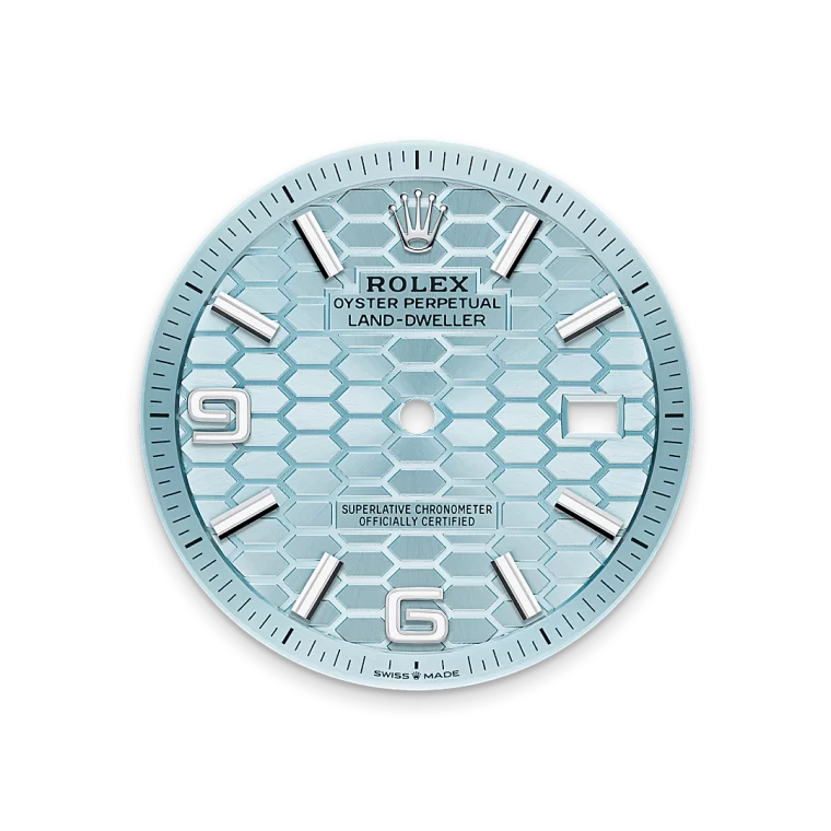 Esta esfera azul glaciar, un color reservado a los relojes elaborados en platino, luce un motivo «nido de abeja» con acabado tipo sol. Se lleva a cabo con ayuda de técnicas tradicionales o de alta tecnología, todas ellas realizadas de forma interna. Para recortar las celdillas y crear las estrías de las ranuras que las separan, se utiliza un láser de femtosegundo. La esfera cuenta con visualización Chromalight; los números abiertos y los índices luminiscentes le confieren una legibilidad óptima en cualquier circunstancia. Las agujas, también luminiscentes, han sido especialmente diseñadas para el modelo.