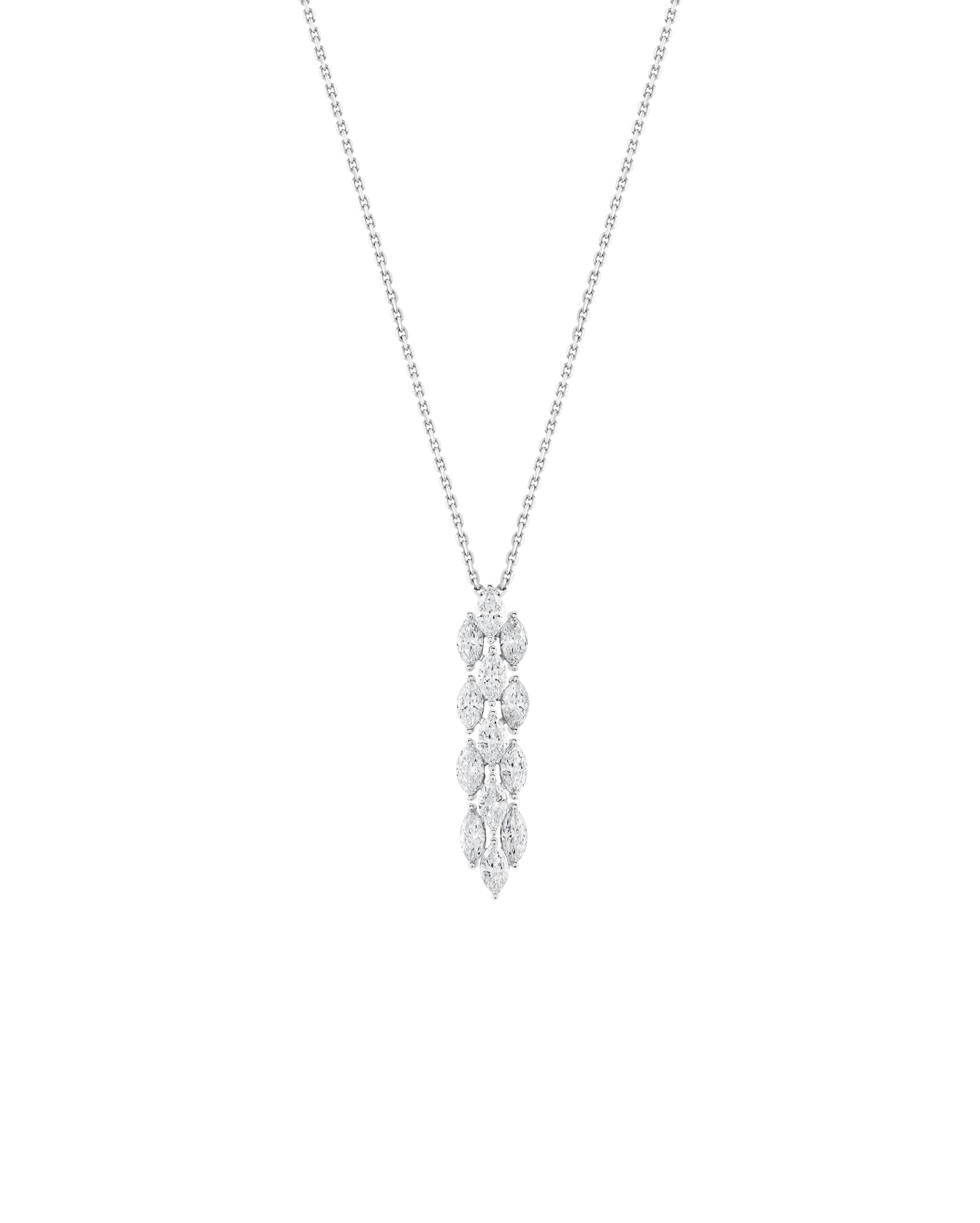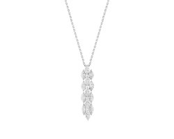 Collar en oro blanco de 18k con cadena fina y pendiente central en caída vertical, compuesto por diamantes corte marquise engastados de forma alineada. Una pieza elegante y estilizada que aporta luz y sofisticación con un diseño limpio y contemporáneo.