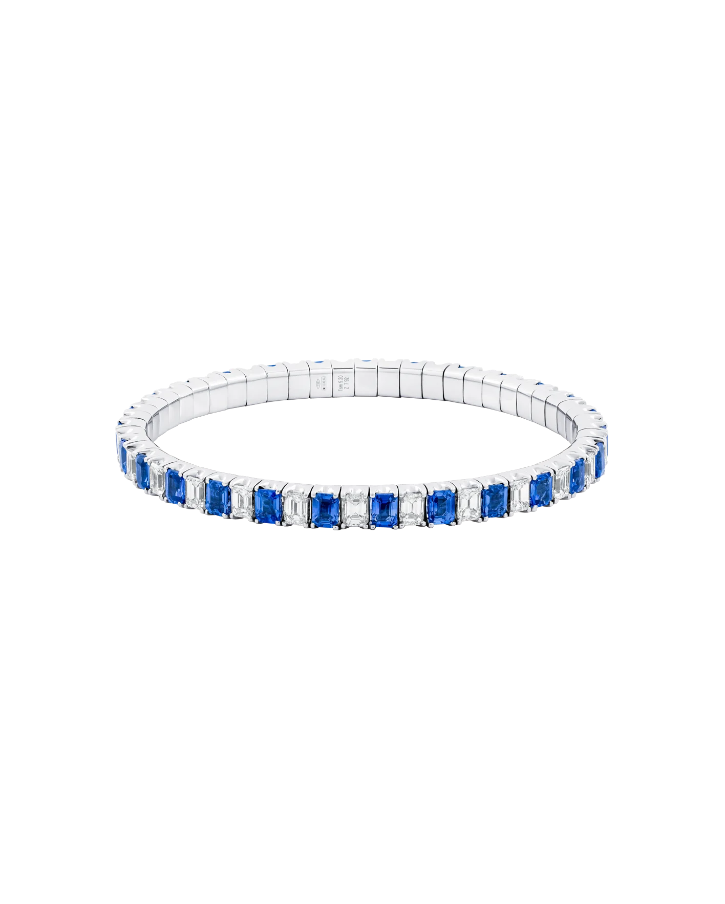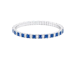 Pulsera de oro blanco 18k con mecanismo stretch que se adapta cómodamente a la muñeca. Está compuesta por 27 zafiros de intenso azul y 27 diamantes de corte esmeralda, alternados de forma armoniosa para crear un equilibrio perfecto entre color y brillo. Una pieza elegante, cómoda y atemporal.