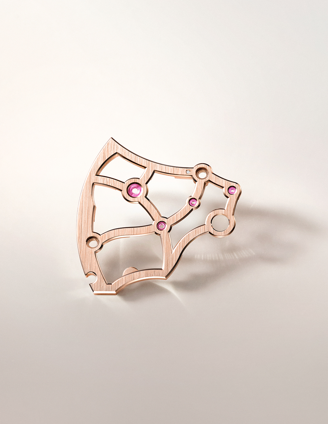 Ah, y ubicado a las 7 tenemos un toubillon volante. El cual tiene una rueda de balance hecha de silicio. Esto ayuda para proteger al mecanismo de campos magnéticos y como es liviana, también ayuda a que sea más preciso. Entonces ahí van 3 complicaciones.