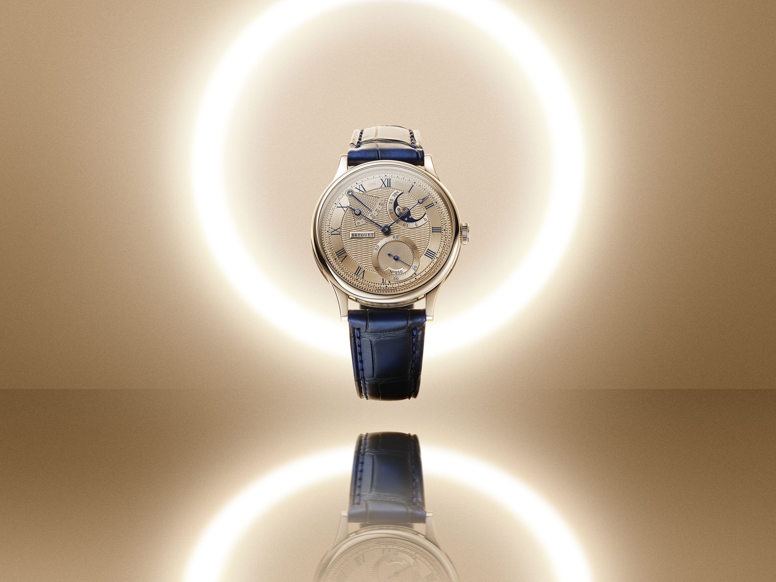 El Classique 7235 viene con una correa de piel de caimán color azul marino con una hebilla ardillón de oro Breguet de 18 quilates.