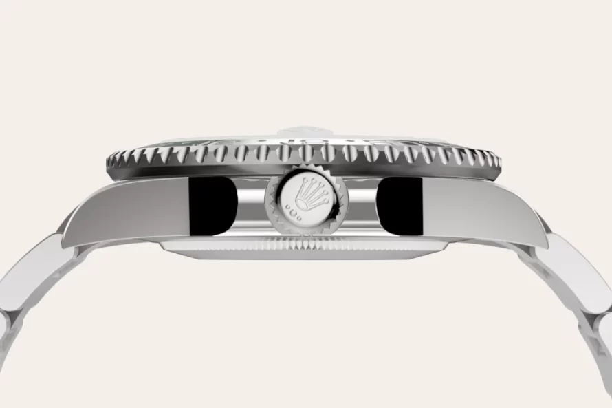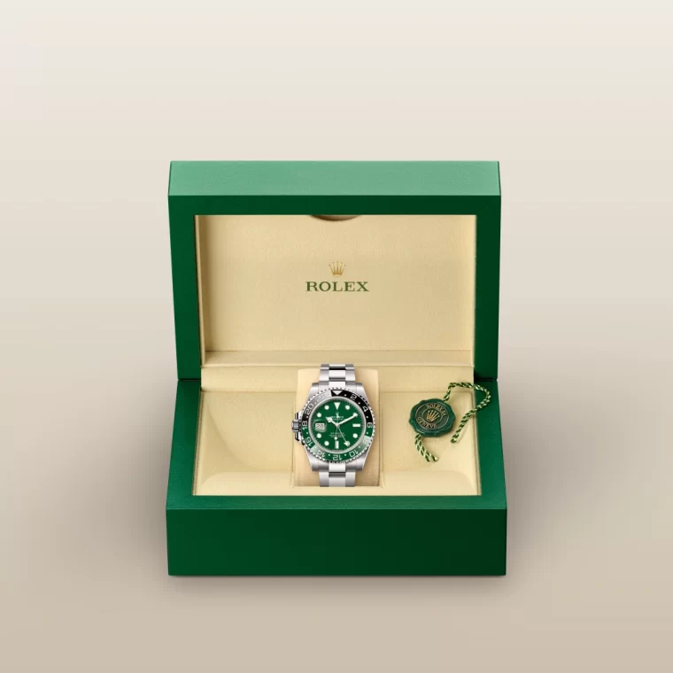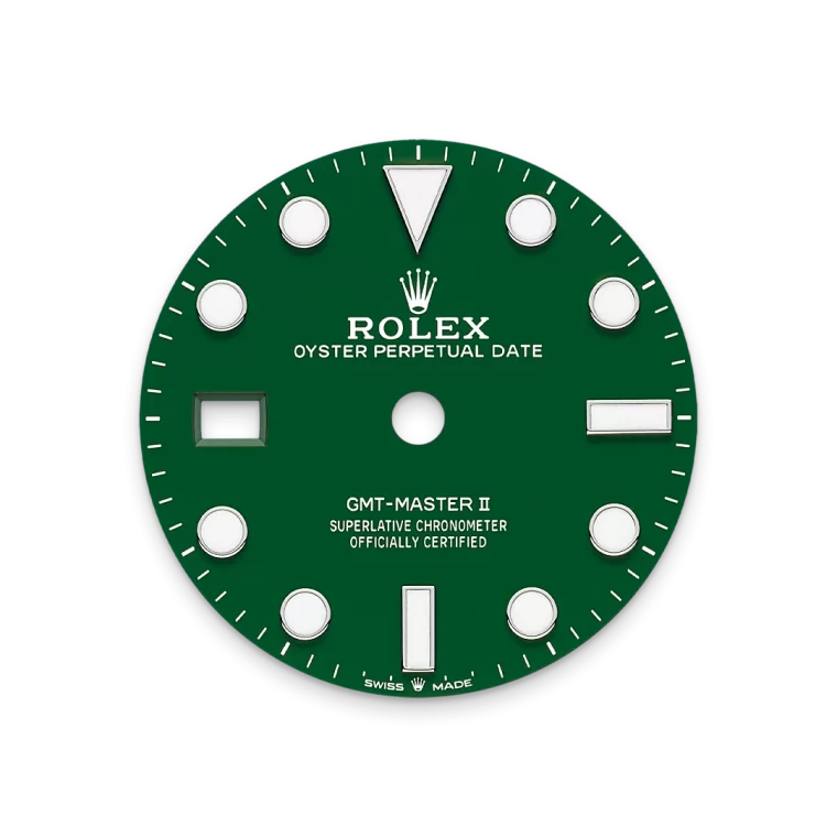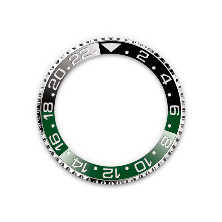 Este modelo presenta una esfera cerámica verde y un disco de bisel Cerachrom bicolor en cerámica verde y negra bicolor. El GMT‑Master II dispone de una aguja adicional que da la vuelta a la esfera en 24 horas y complementa a las tradicionales agujas de las horas, minutos y segundos, así como de un bisel giratorio bidireccional graduado 24 horas. La aguja adicional de 24 horas, con su color distintivo, indica la hora de referencia, la del lugar de residencia, en un primer huso horario que se lee sobre la graduación del bisel. La hora local del viajero puede ajustarse fácilmente mediante saltos de hora en hora gracias a un astuto mecanismo controlado por la corona: la aguja de las horas puede ajustarse hacia delante o hacia atrás, de forma independiente del minutero y el segundero. Esto permite al viajero adaptar su nuevo huso horario sin que afecte a la precisión. El disco de bisel Cerachrom, por su parte, presenta una combinación inédita de colores: un negro y un verde exclusivo de este modelo.
